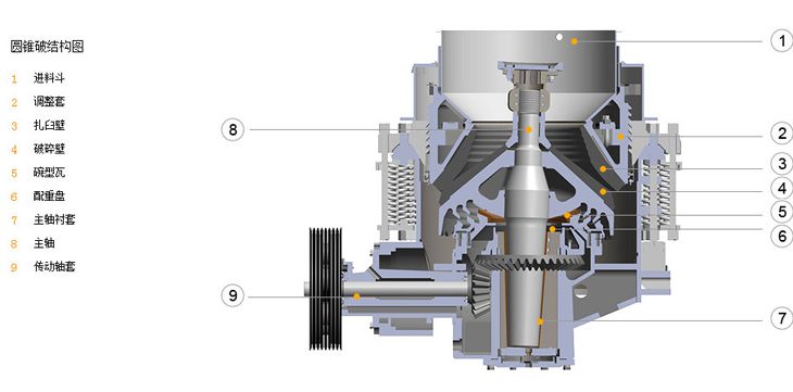 圓錐破碎機(jī)其結(jié)構(gòu)主要有機(jī)架、水平軸、動(dòng)錐體、平衡輪、偏心套、上破碎壁(固定錐)、下破碎壁(動(dòng)錐)、液力偶合器、潤(rùn)滑系統(tǒng)、液壓系統(tǒng)、控制系統(tǒng)等幾部分組成。